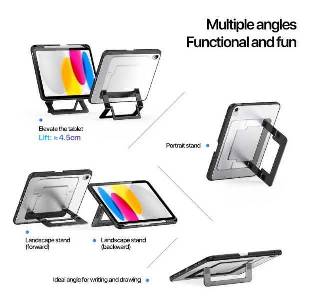 2. Multi-angle stand function supporting portrait, landscape, and 25° writing mode.